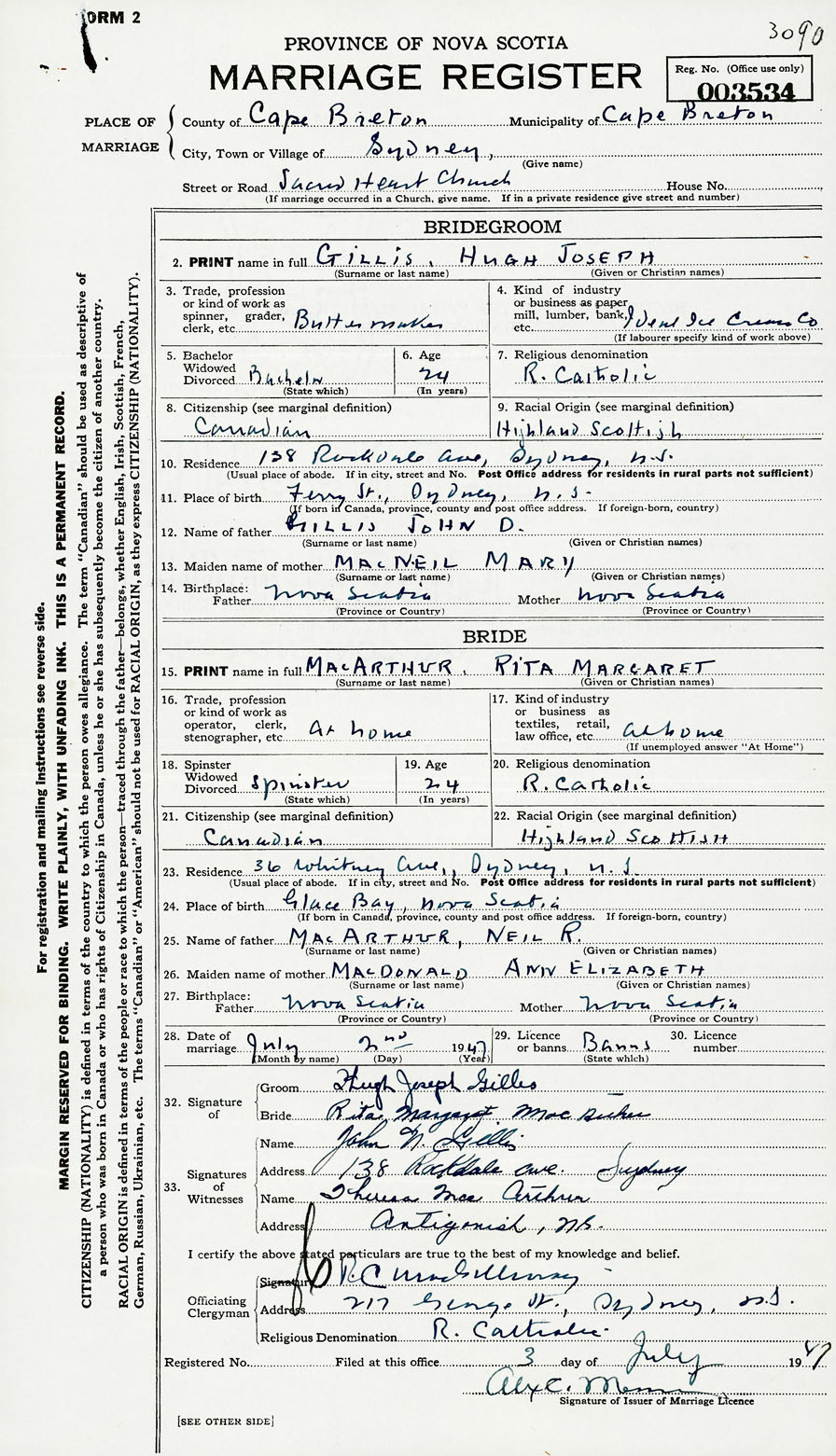 Groom Hugh Joseph Gillis