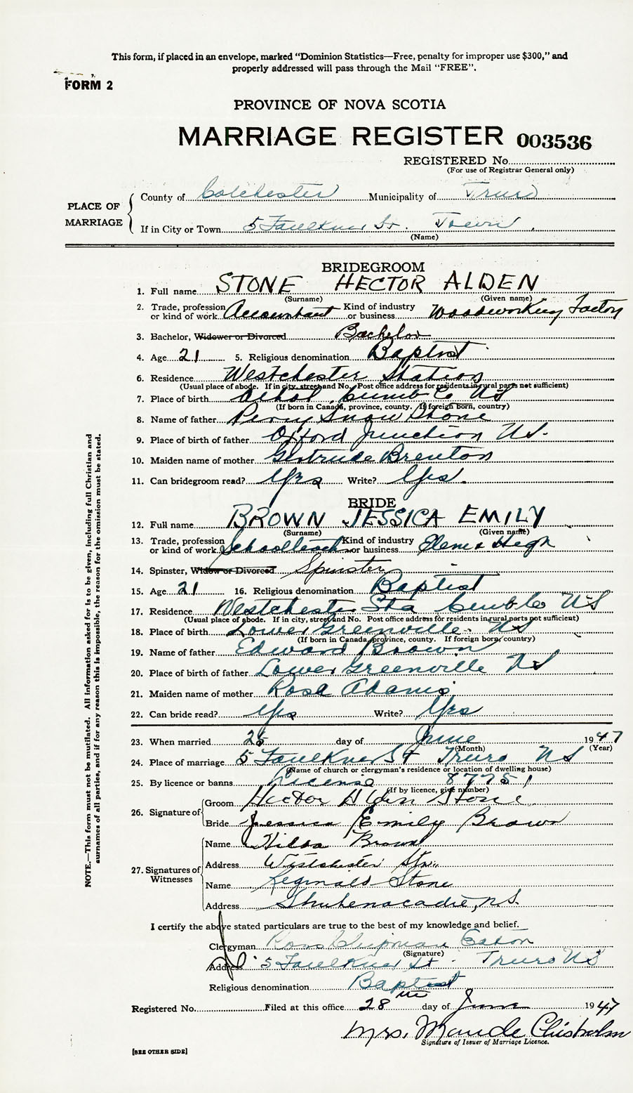26. Place of marriage 5 Faulkner St. Truro, Colchester County