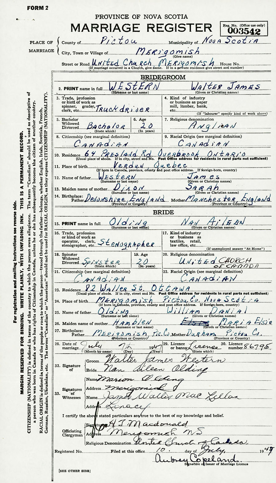 28. Date of marriage July 7 1947 29. By license or banns License 30. License number 86795