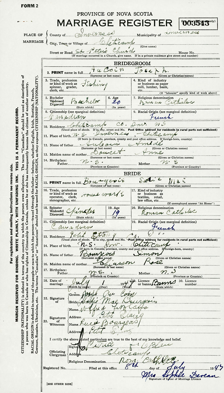24. Place of birth Nova Scotia Inv. Cheticamp