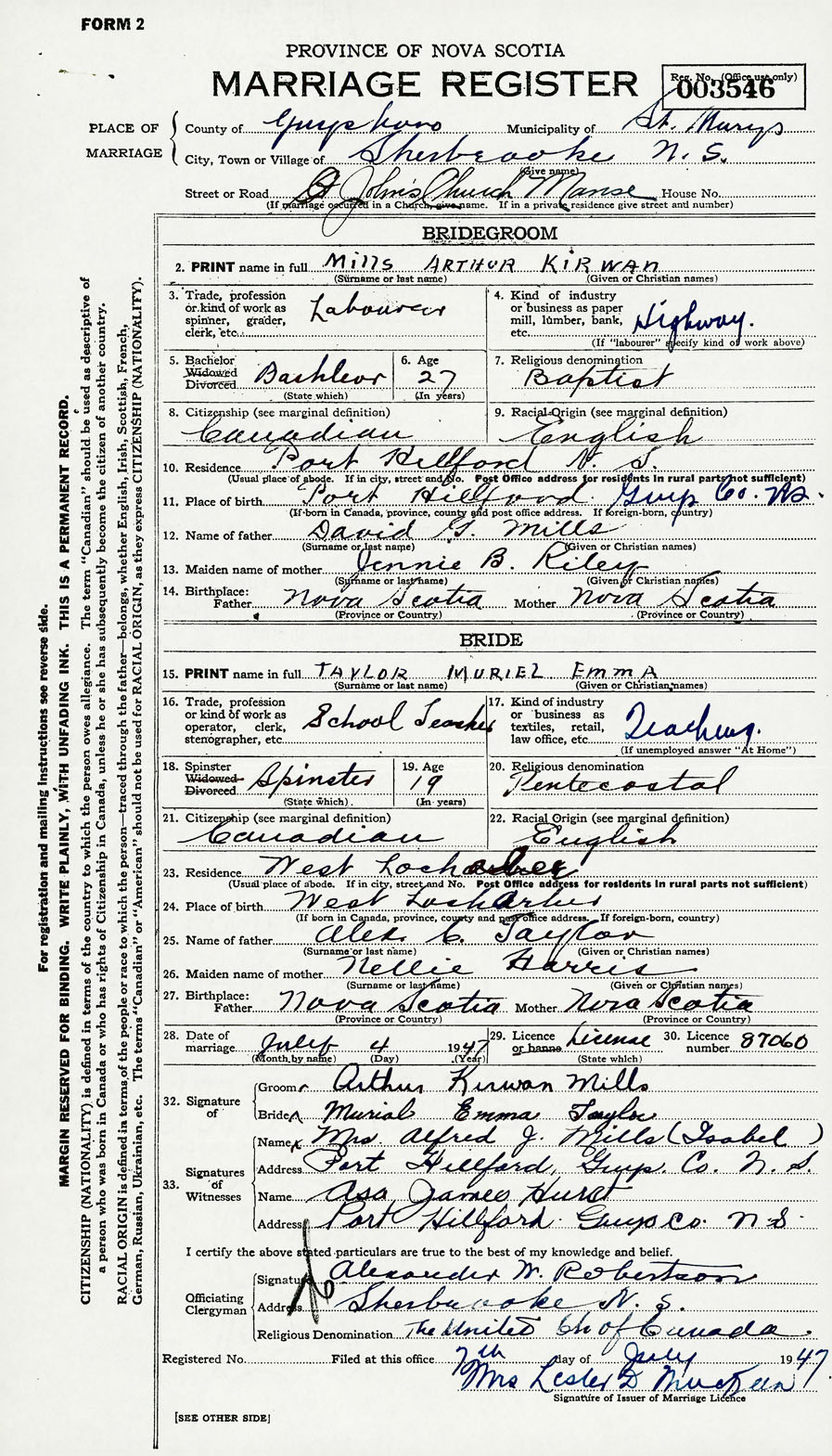 28. Date of marriage July 4 1947 29. By license or banns License 30. License number 87060