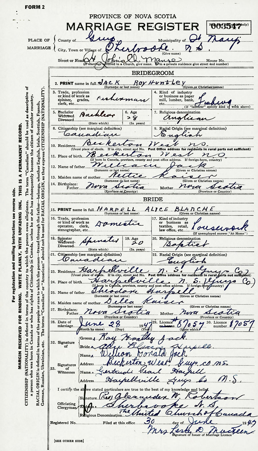 28. Date of marriage June 28 1947 29. By license or banns License 30. License number 87057
