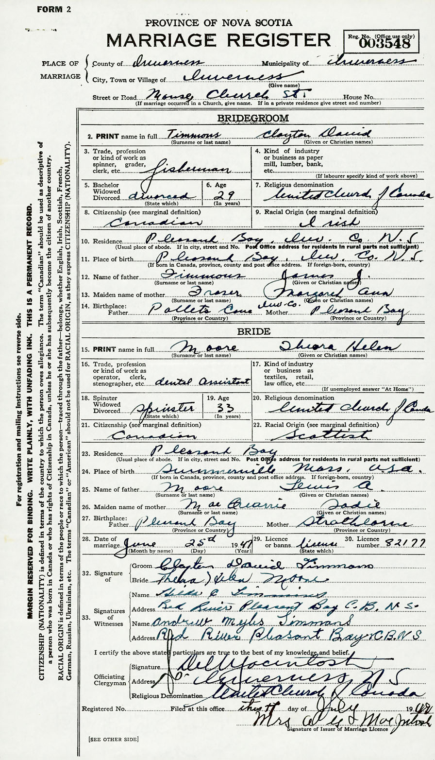 11. Place of birth Pleasant Bay, Inv. County Nova Scotia