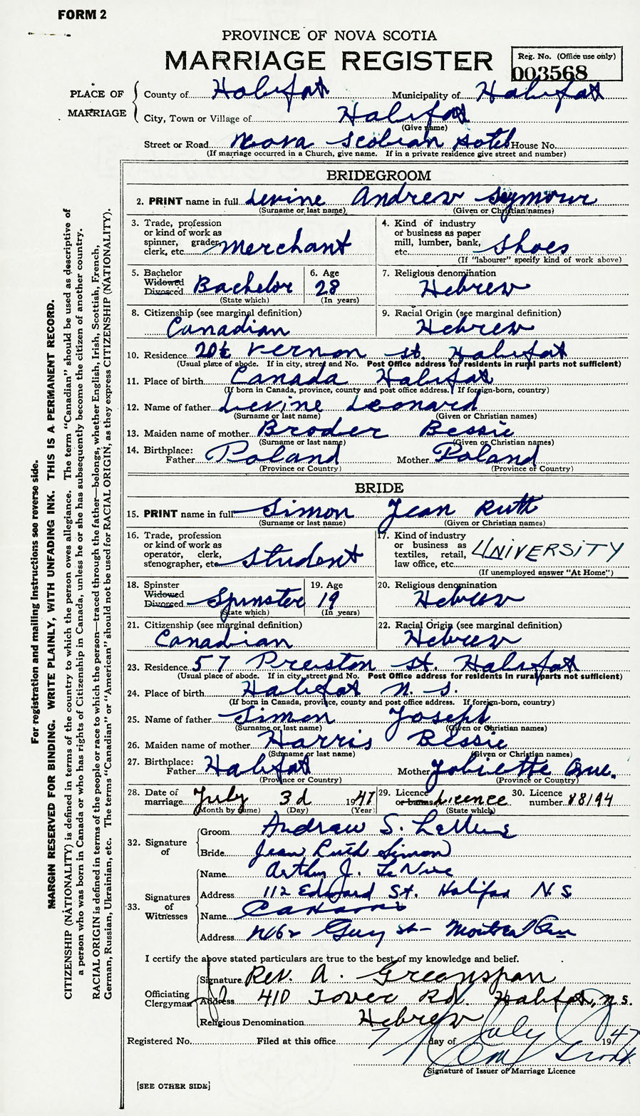28. Date of marriage July 3 1947 29. By license or banns License 30. License number 88194