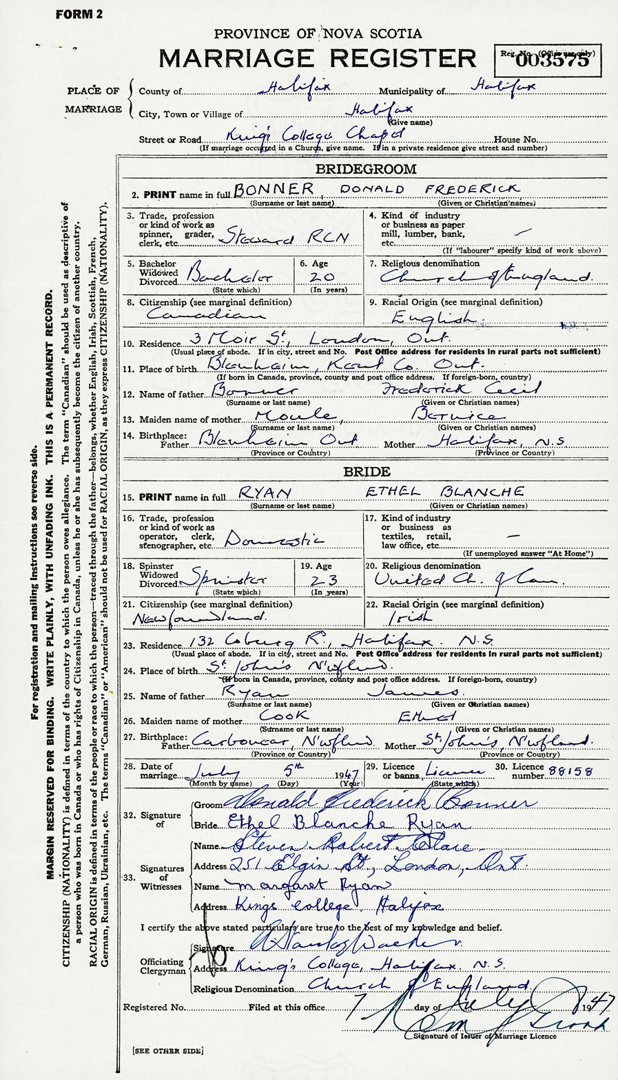 28. Date of marriage July 5 1947 29. By license or banns License 30. License number 88158