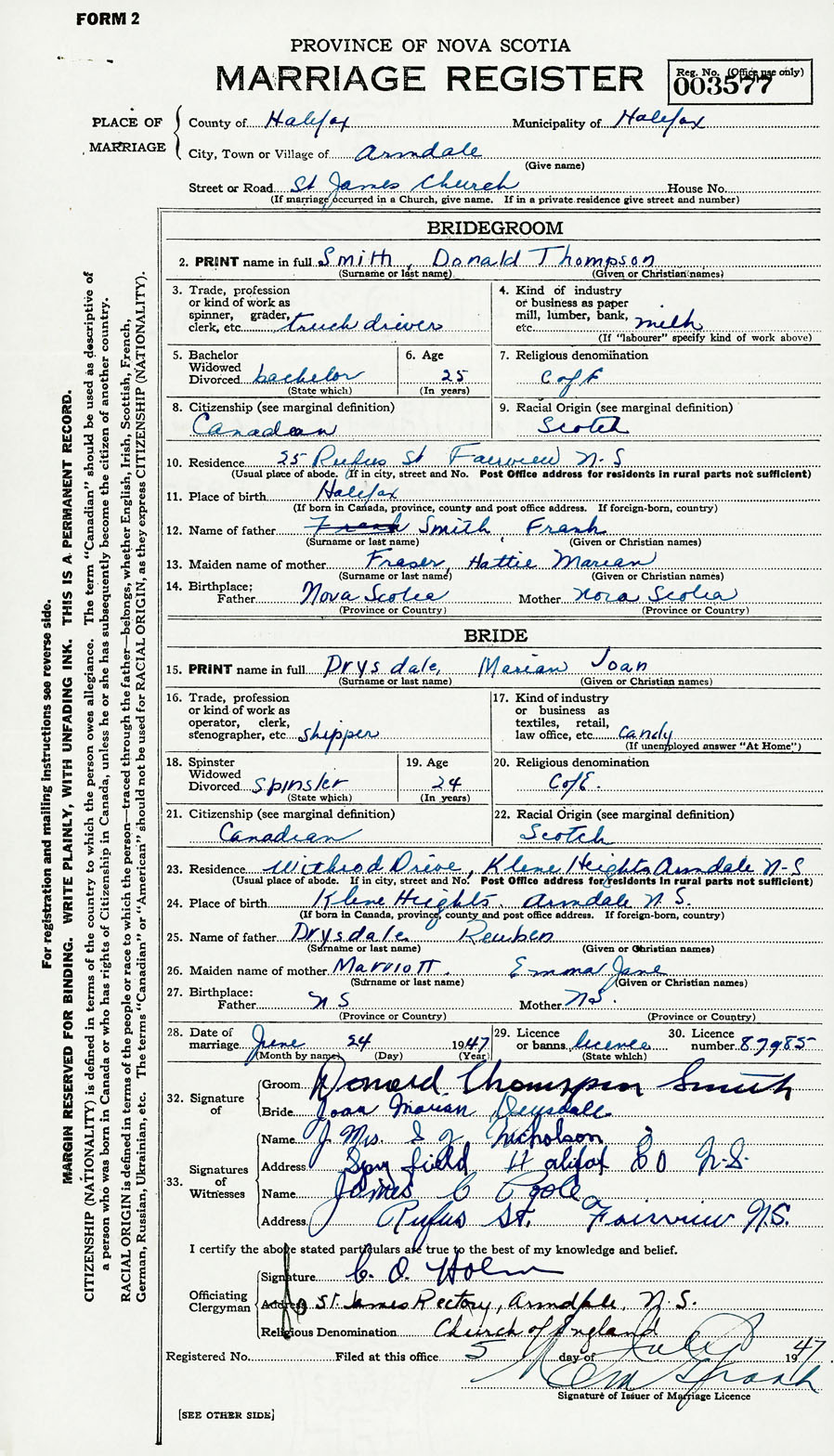 28. Date of marriage June 24 1947 29. By license or banns License 30. License number 89985