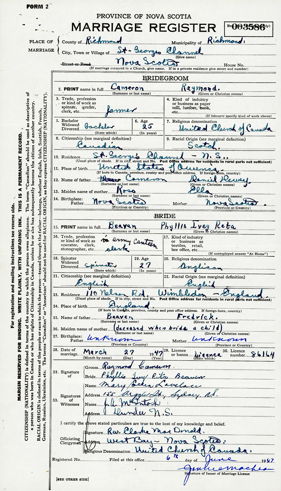 28. Date of marriage March 27 1947 29. By license or banns License 30. License number 86164