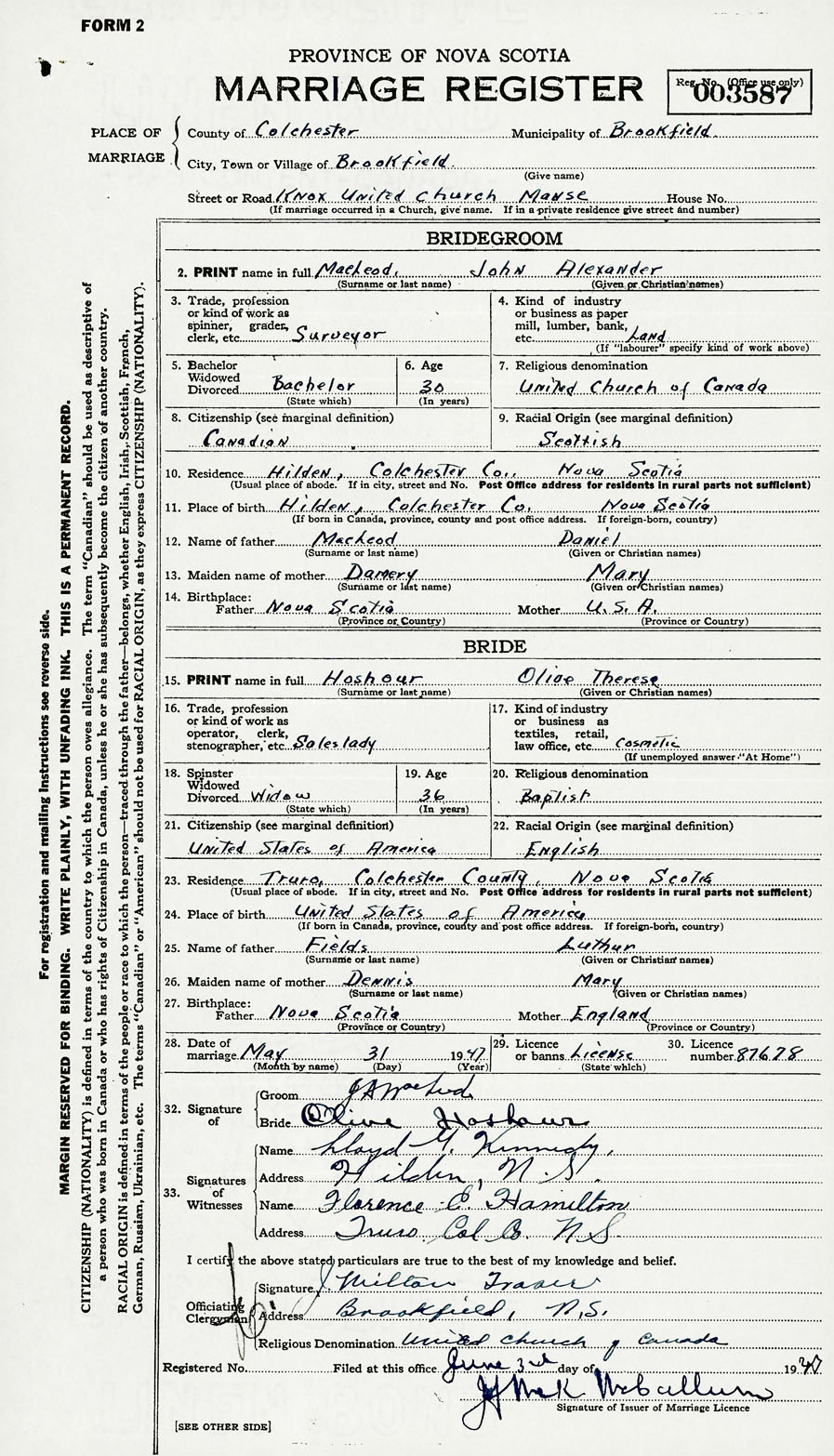 28. Date of marriage May 31 1947 29. By license or banns License 30. License number 87678