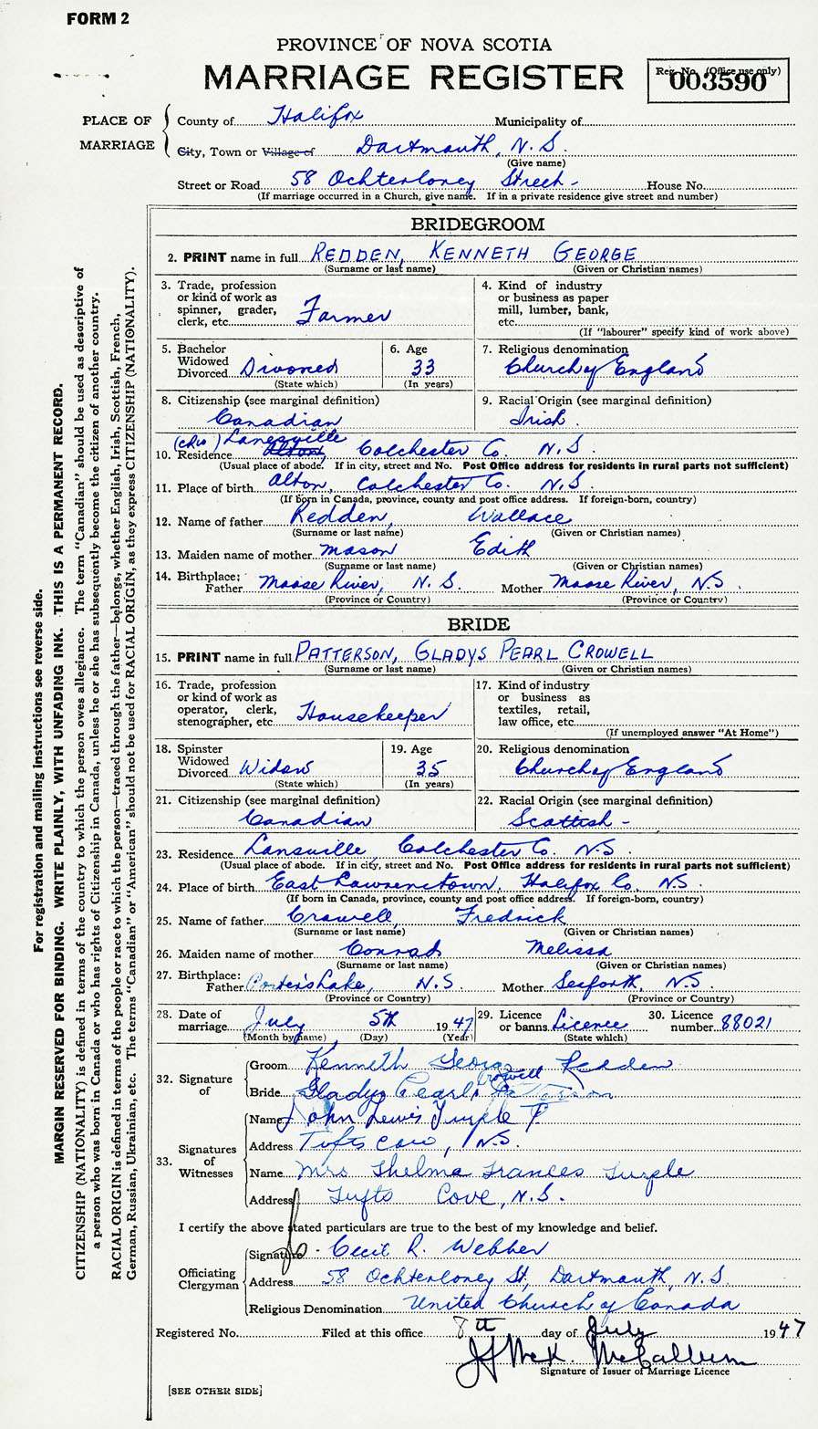 28. Date of marriage July 5 1947 29. By license or banns License 30. License number 88021