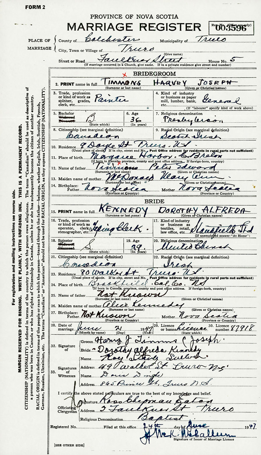 28. Date of marriage June 21 1947 29. By license or banns License 30. License number 87918