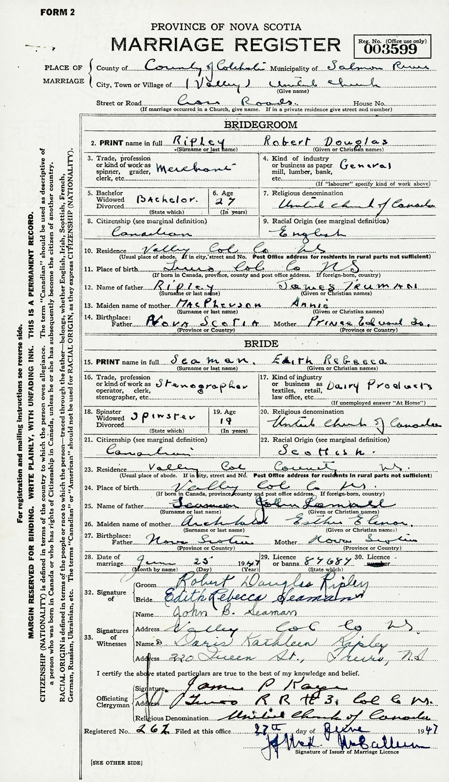 28. Date of marriage June 25 1947 29. By license or banns License 30. License number 87687