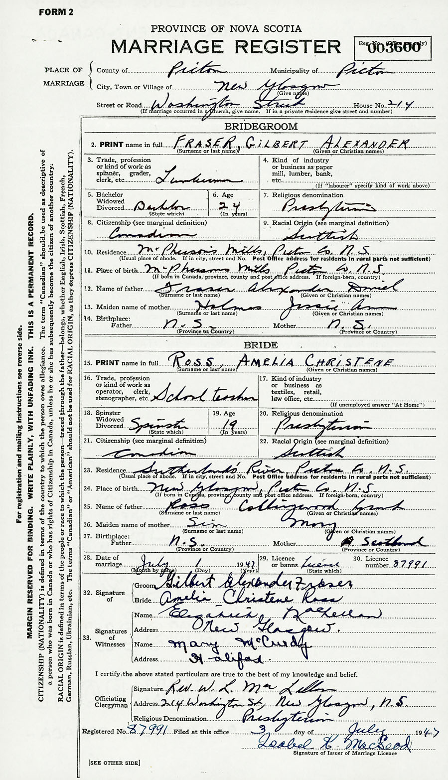 28. Date of marriage July 1 1947 29. By license or banns License 30. License number 87991