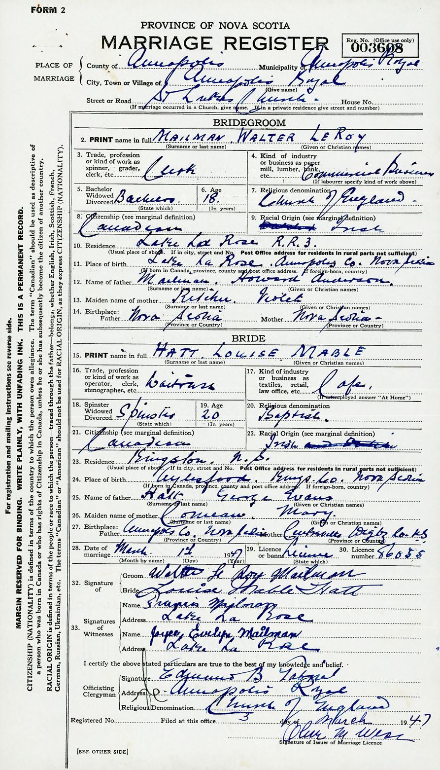 28. Date of marriage March 1 1947 29. By license or banns License 30. License number 86055