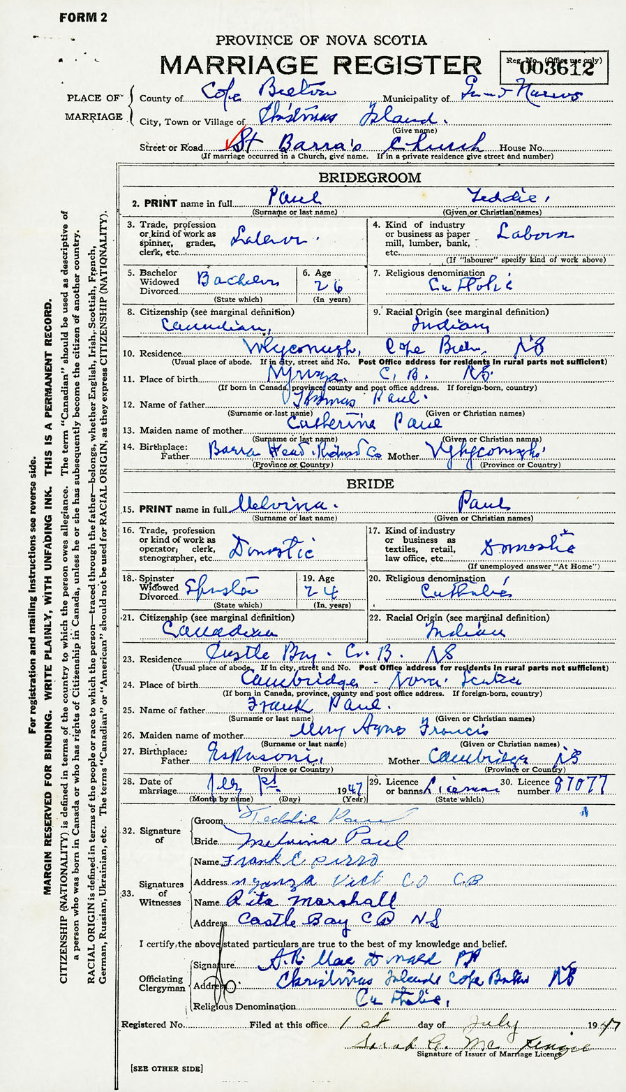 28. Date of marriage July 1 1947 29. By license or banns License 30. License number 87077