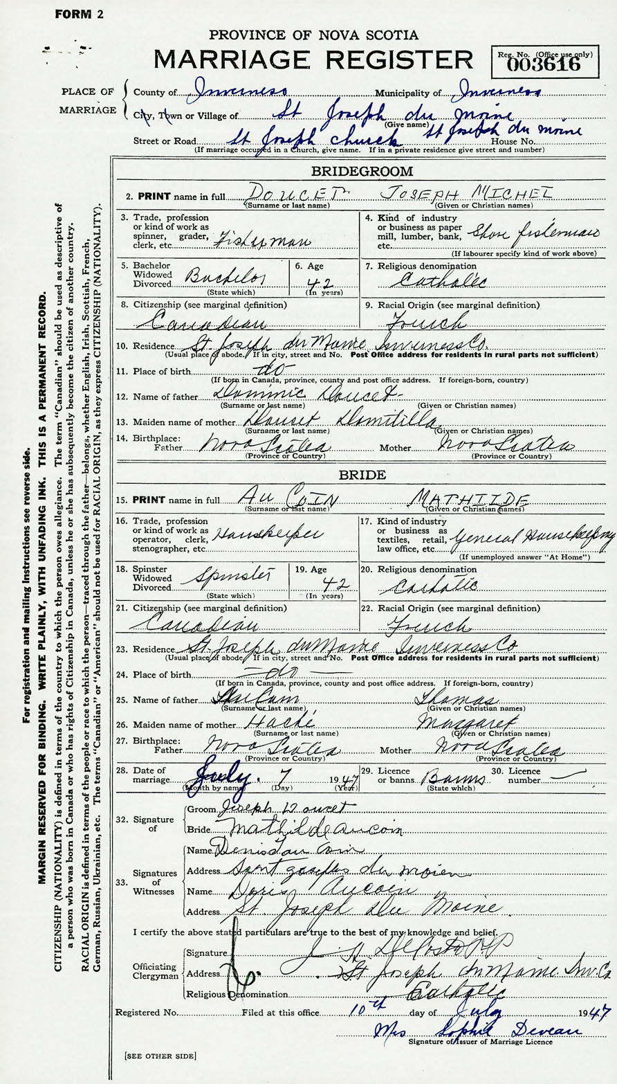 28. Date of marriage July 7 1947 29. By license or banns License 30. License number
