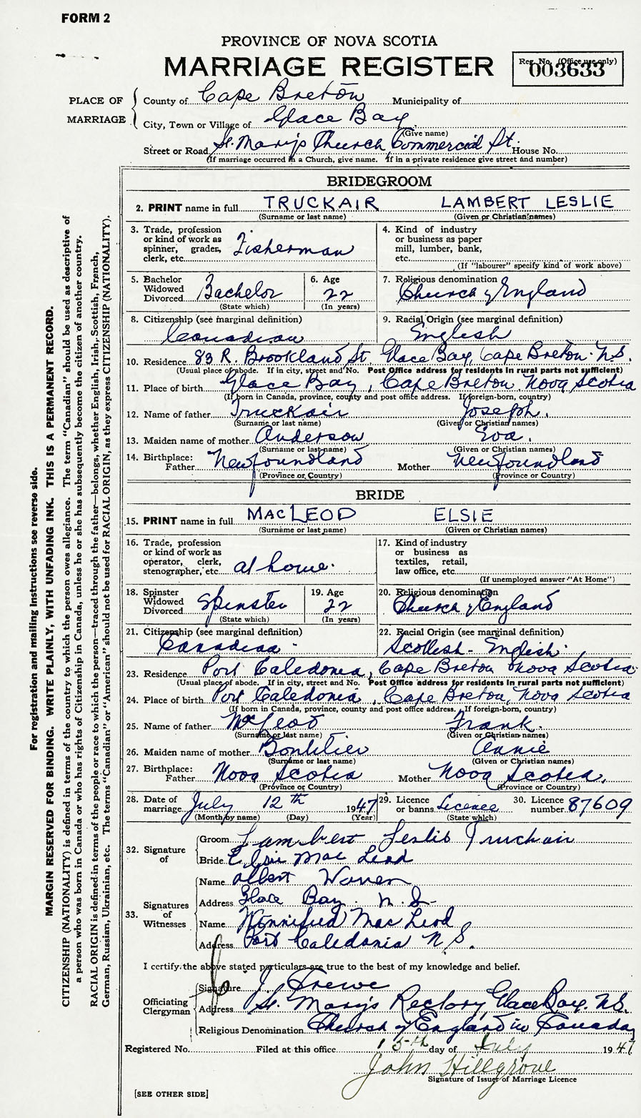 28. Date of marriage July 12 1947 29. By license or banns License 30. License number 87609