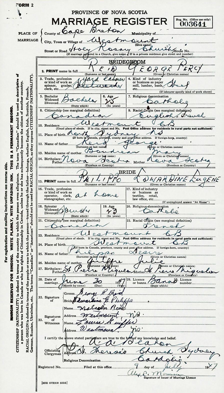 28. Date of marriage June 30 1947 29. By license or banns License 30. License number