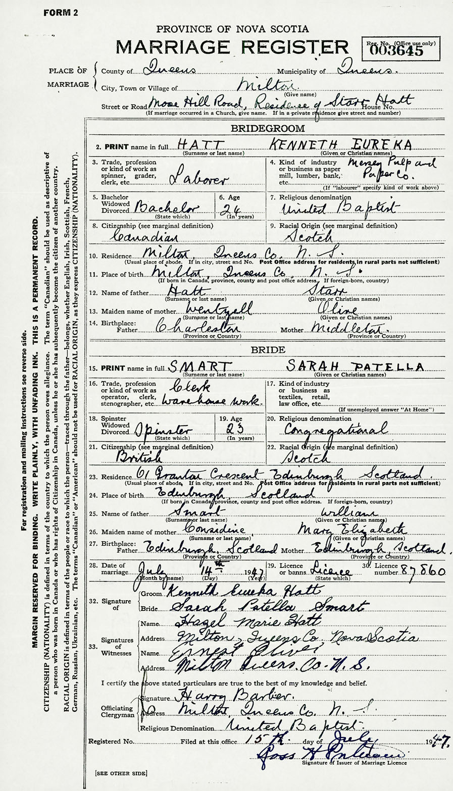 28. Date of marriage July 14 1947 29. By license or banns License 30. License number 87860