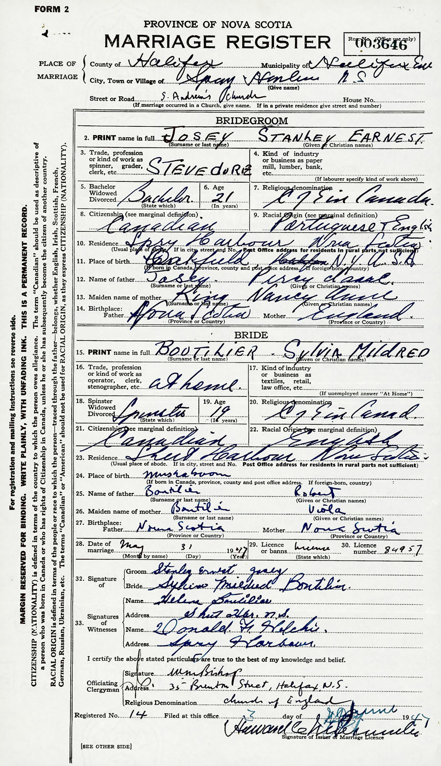 28. Date of marriage May 31 1947 29. By license or banns License 30. License number 84957