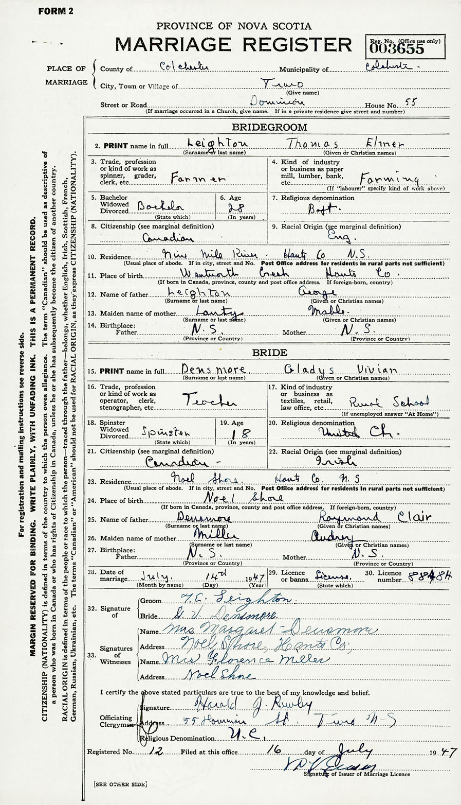 28. Date of marriage July 14 1947 29. By license or banns License 30. License number 88484