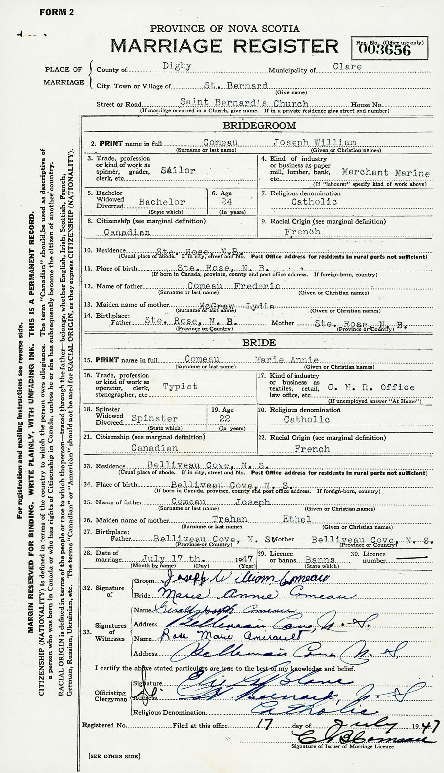 Groom Joseph William Comeau