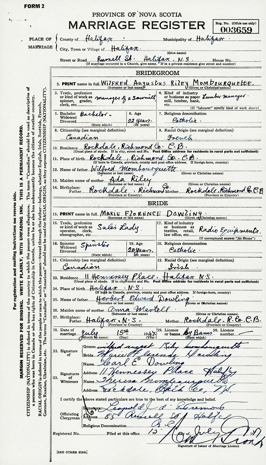 2. PRINT name in full Mombourquette, Wilfred Augustus Riley