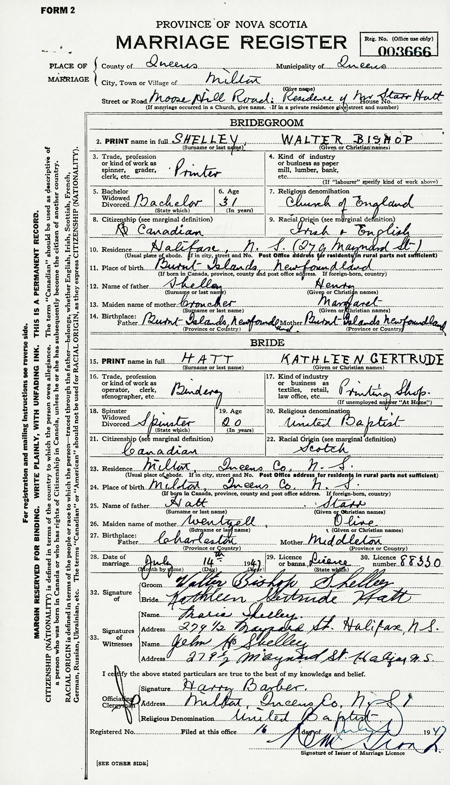 28. Date of marriage July 14 1947 29. By license or banns License 30. License number 88330