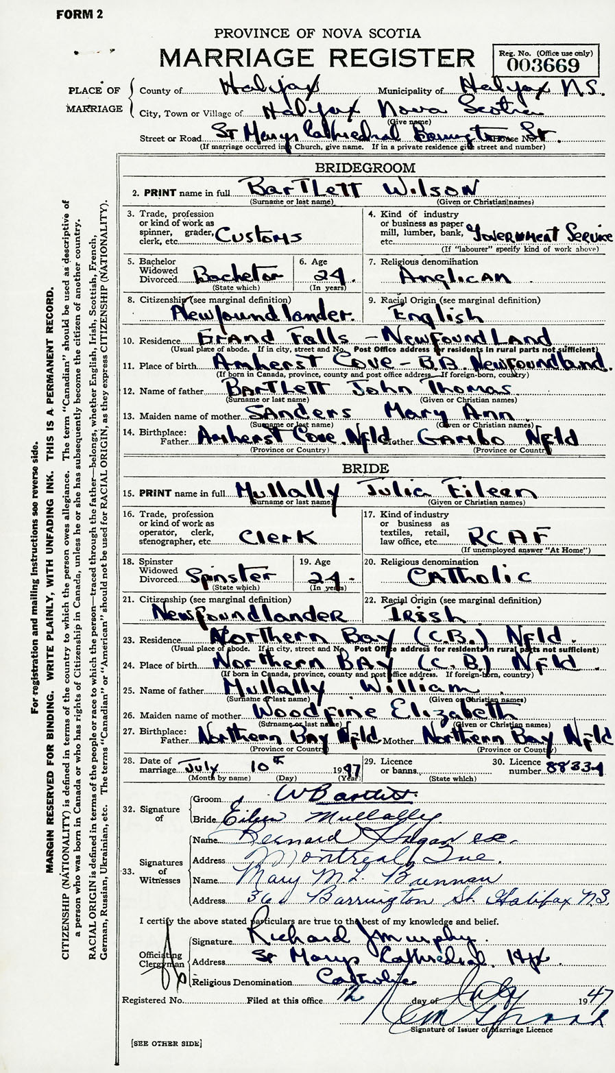 28. Date of marriage July 10 1947 29. By license or banns License 30. License number 88334
