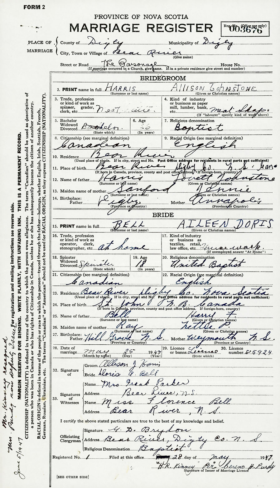 28. Date of marriage May 25 1947 29. By license or banns License 30. License number 85924