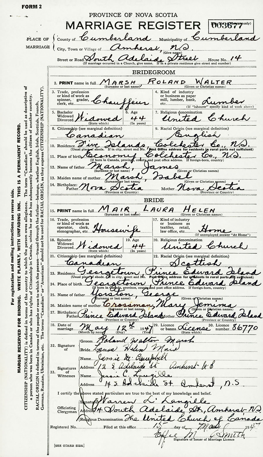 28. Date of marriage May 12 1947 29. By license or banns License 30. License number 86770