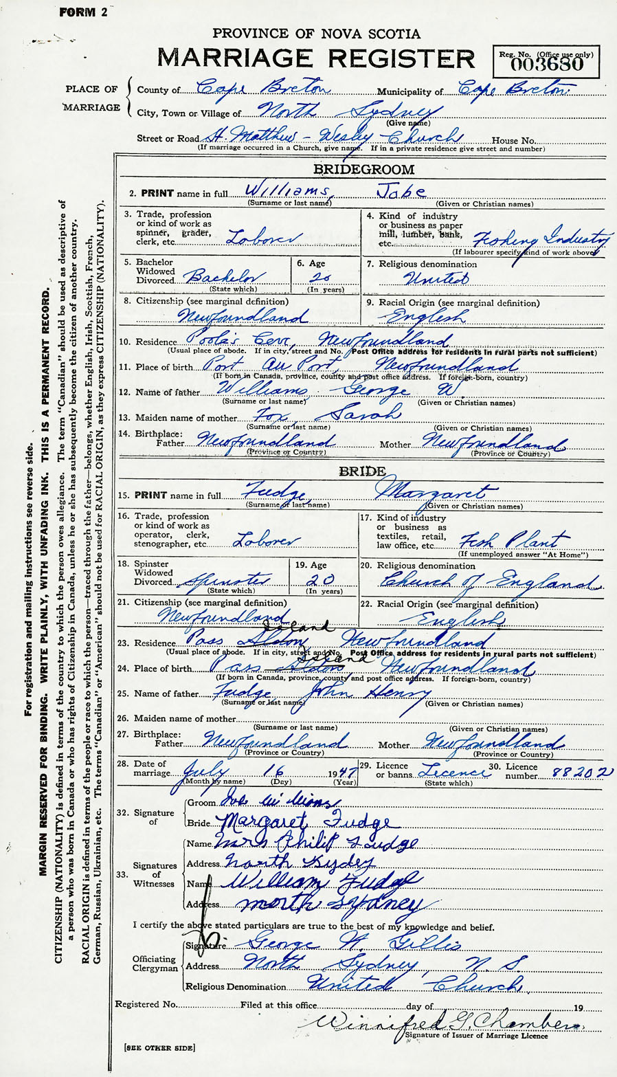 28. Date of marriage July 16 1947 29. By license or banns License 30. License number 88202