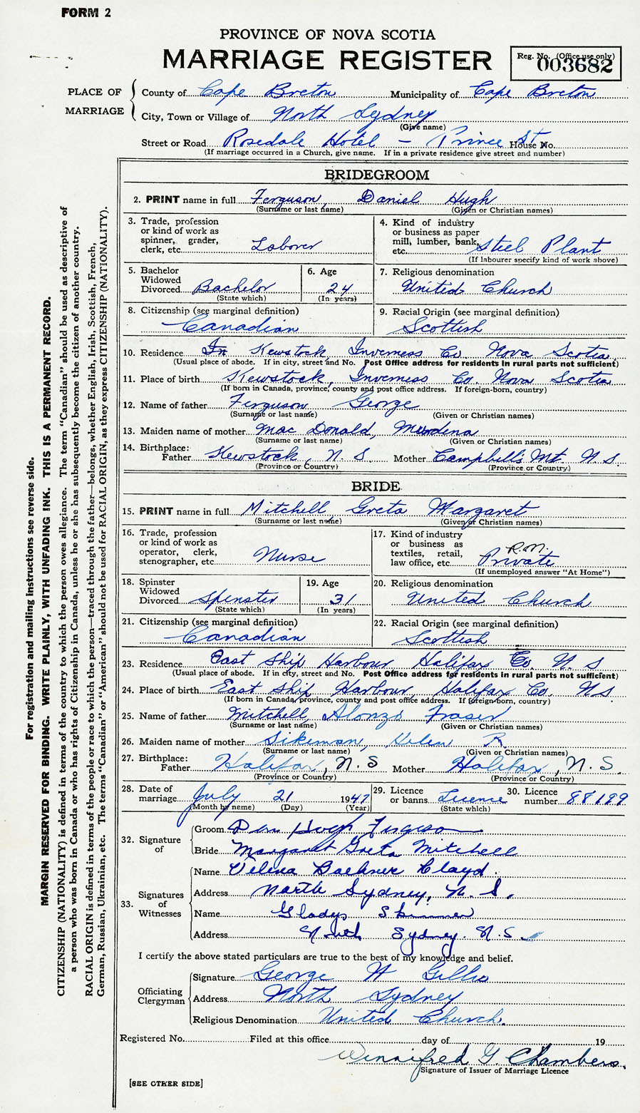 28. Date of marriage July 21 1947 29. By license or banns License 30. License number 88199