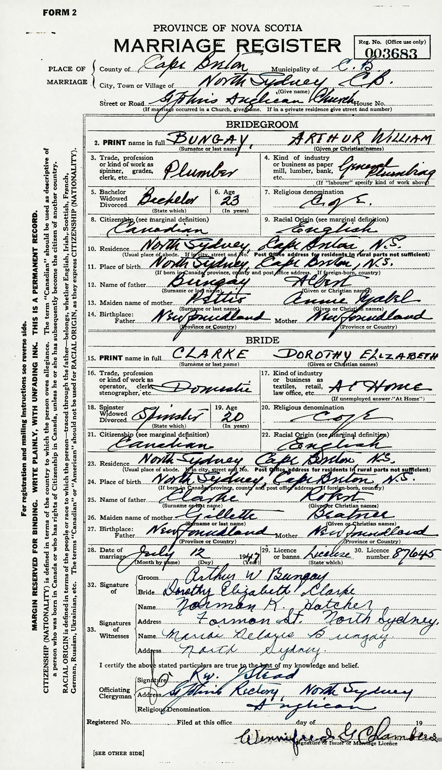 11. Place of birth North Sydney, Cape Breton, Nova Scotia