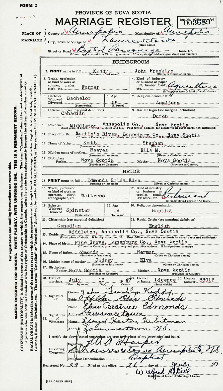 28. Date of marriage July 16 1947 29. By license or banns License 30. License number 88013