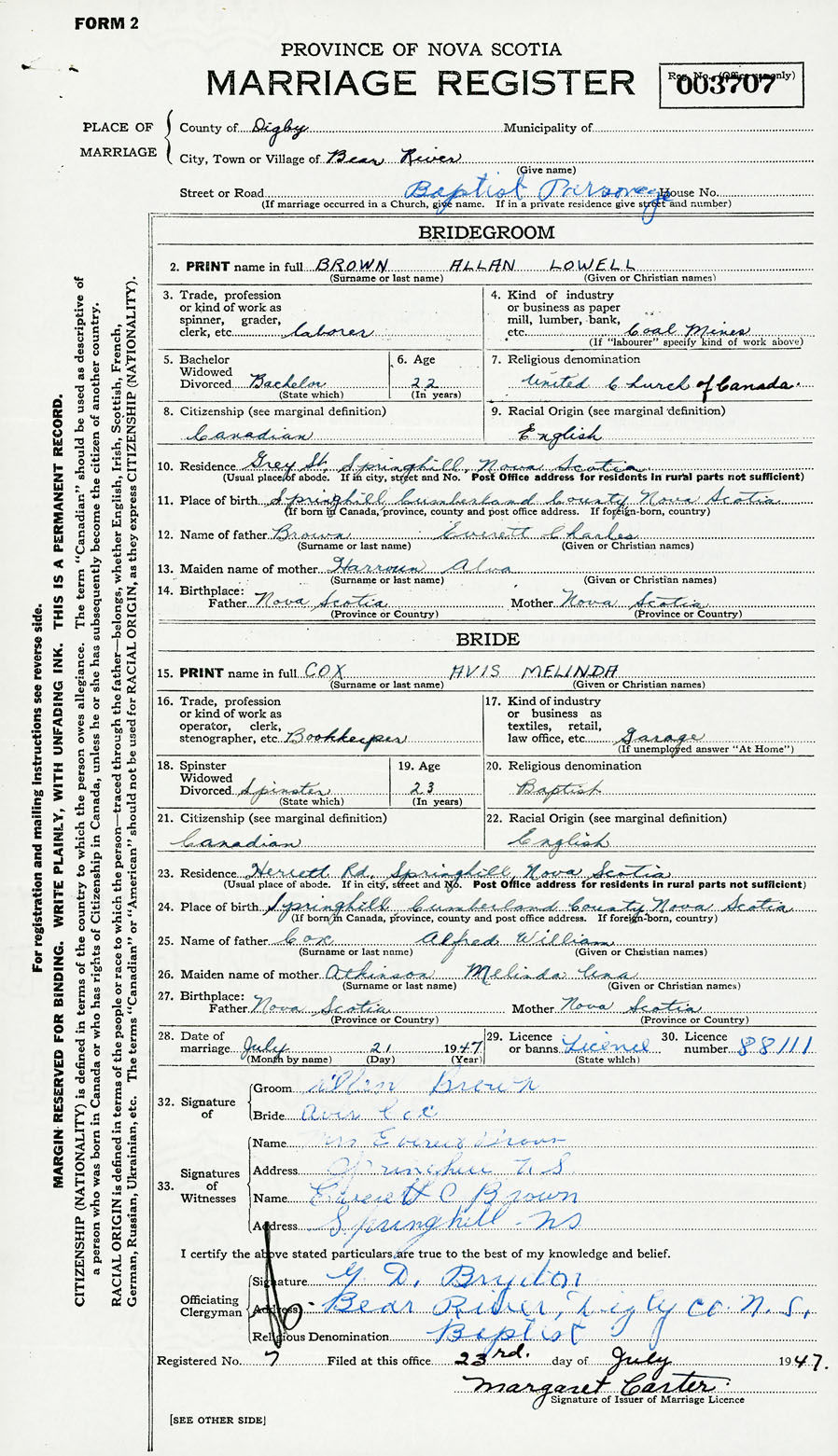 Registration: Year: 1947 number: 003707