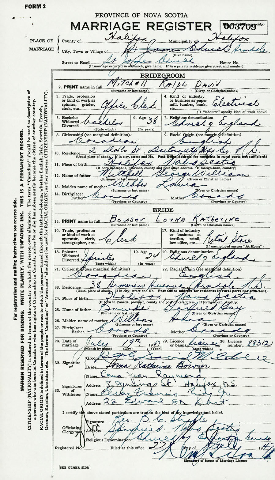 28. Date of marriage July 19 1947 29. By license or banns License 30. License number 88312