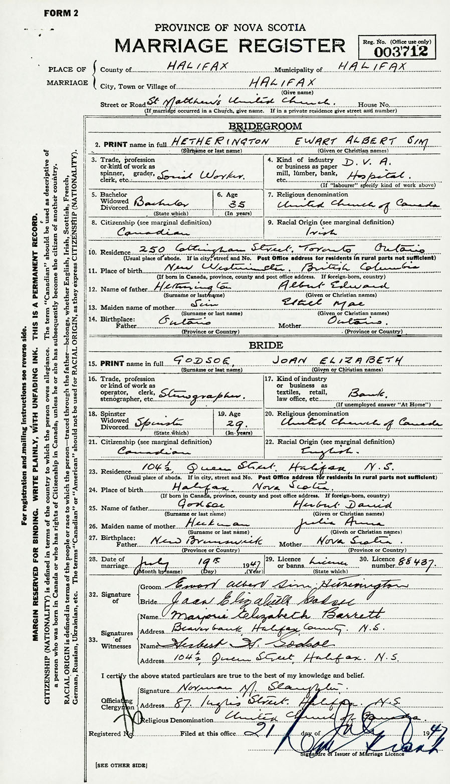 28. Date of marriage July 19 1947 29. By license or banns License 30. License number 88437