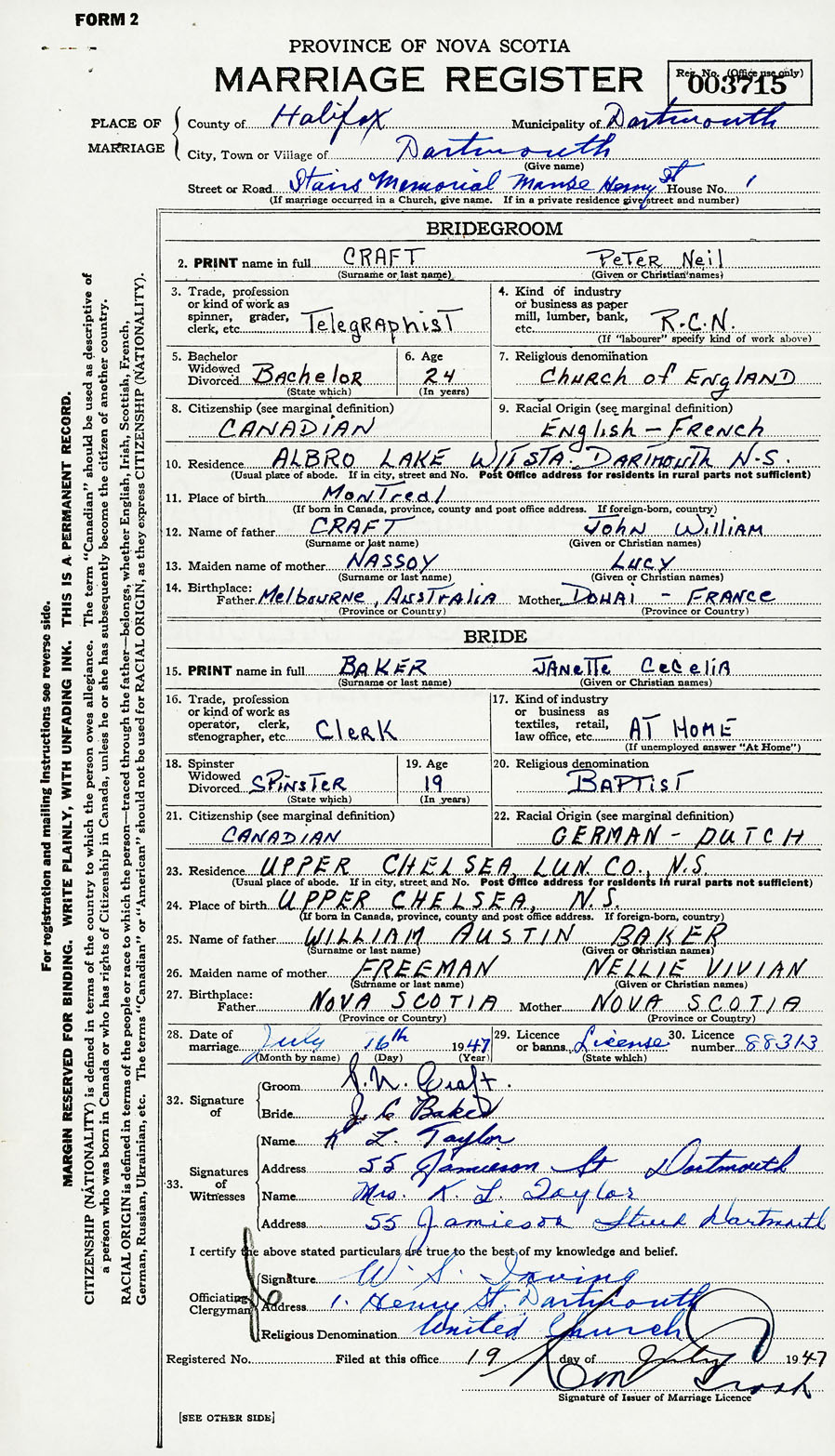 28. Date of marriage July 16 1947 29. By license or banns License 30. License number 88313