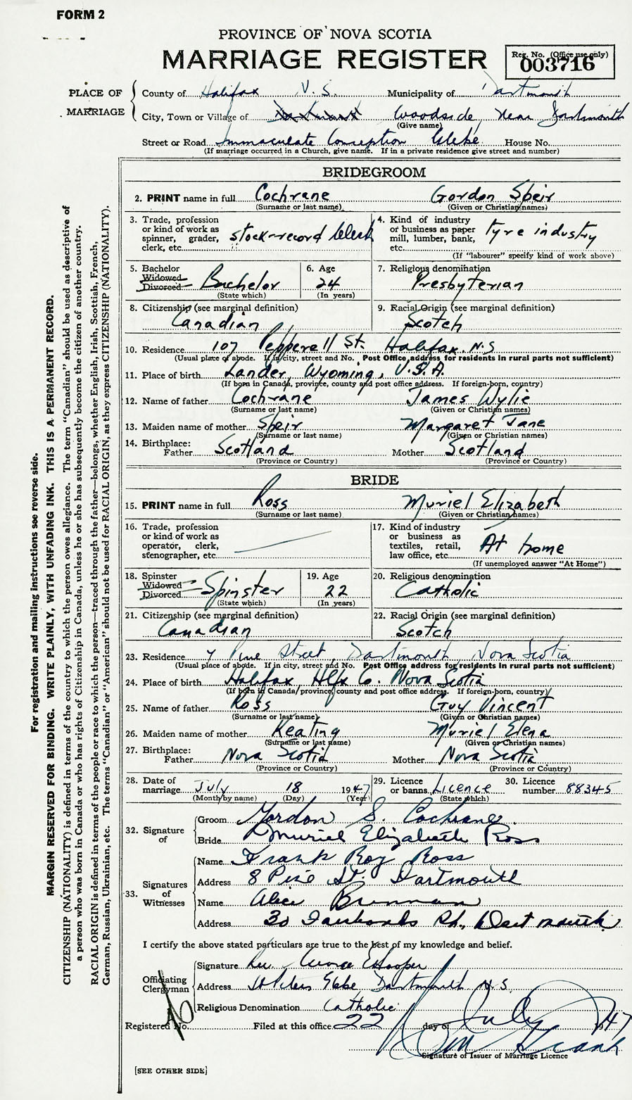 28. Date of marriage July 18 1947 29. By license or banns License 30. License number 88345
