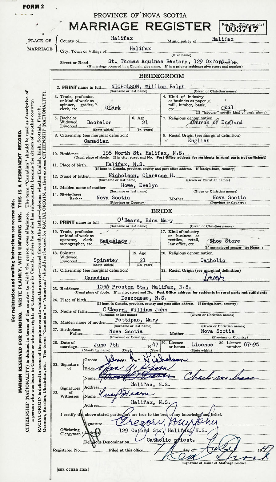 28. Date of marriage June 7 1947 29. By license or banns License 30. License number 87495