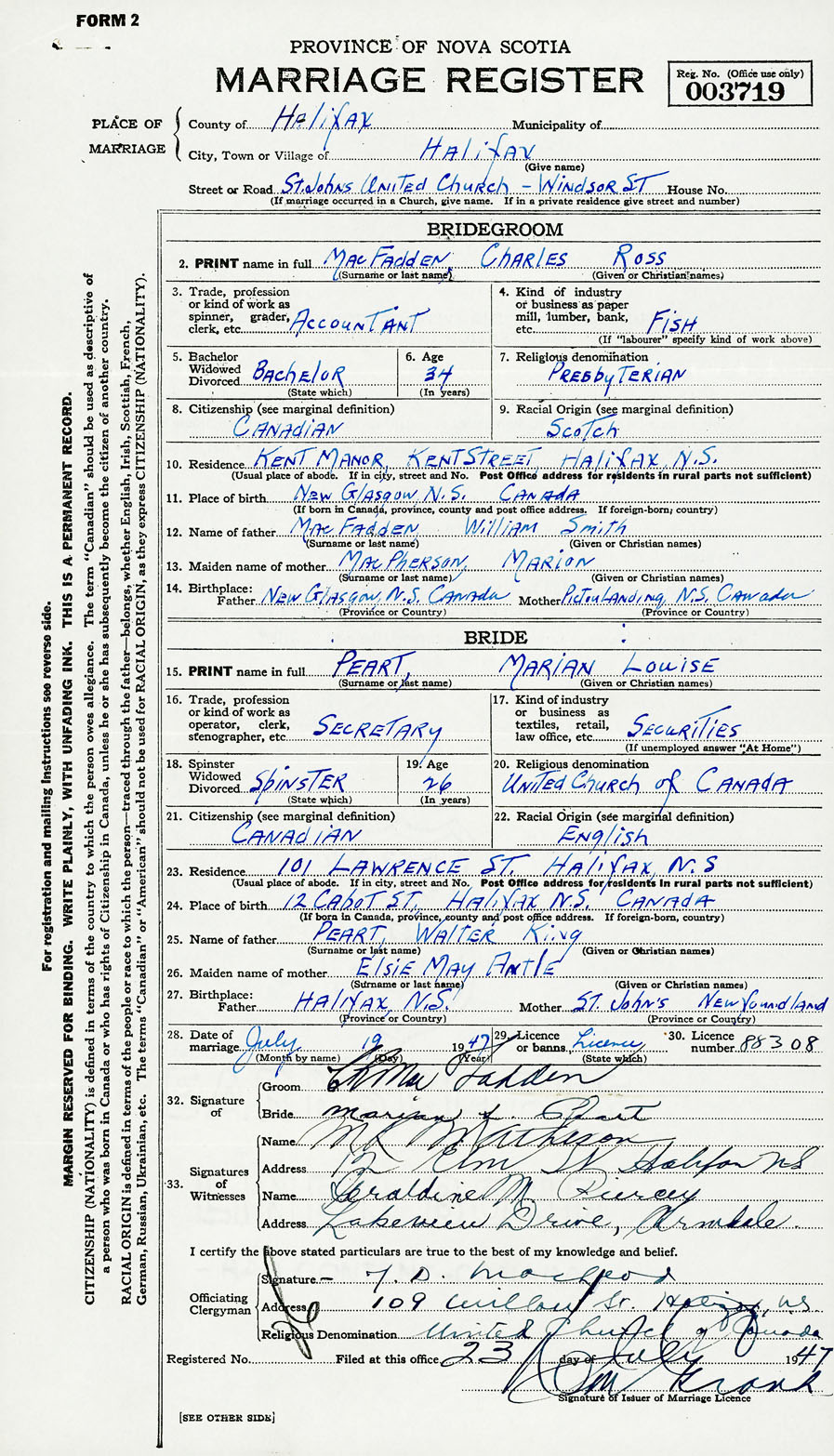28. Date of marriage July 19 1947 29. By license or banns License 30. License number 88308
