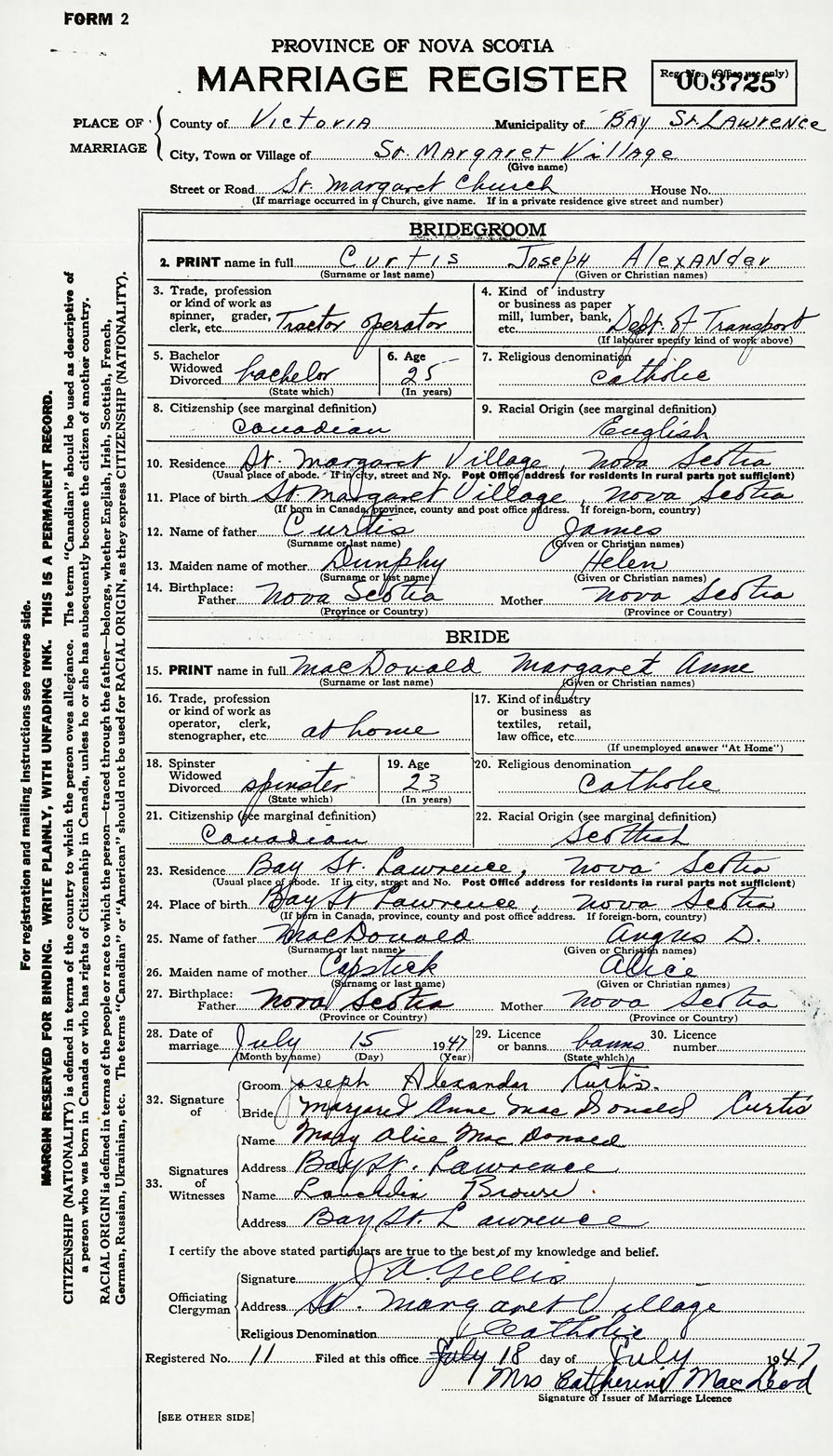 24. Place of birth Bay St.Lawrence, Nova Scotia