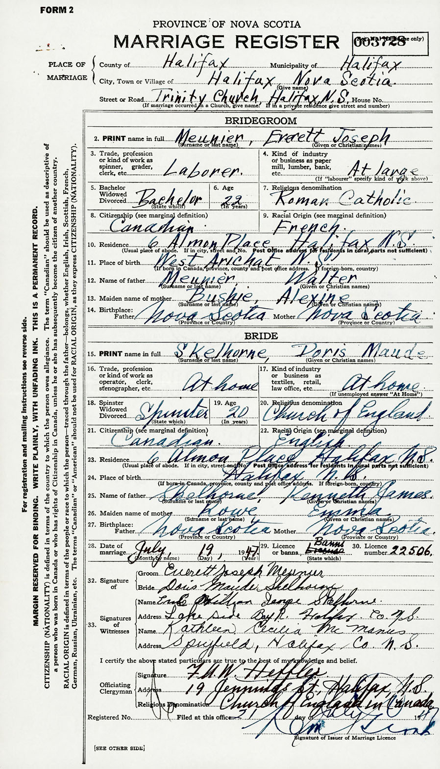 28. Date of marriage July 19 1947 29. By license or banns License 30. License number 22506