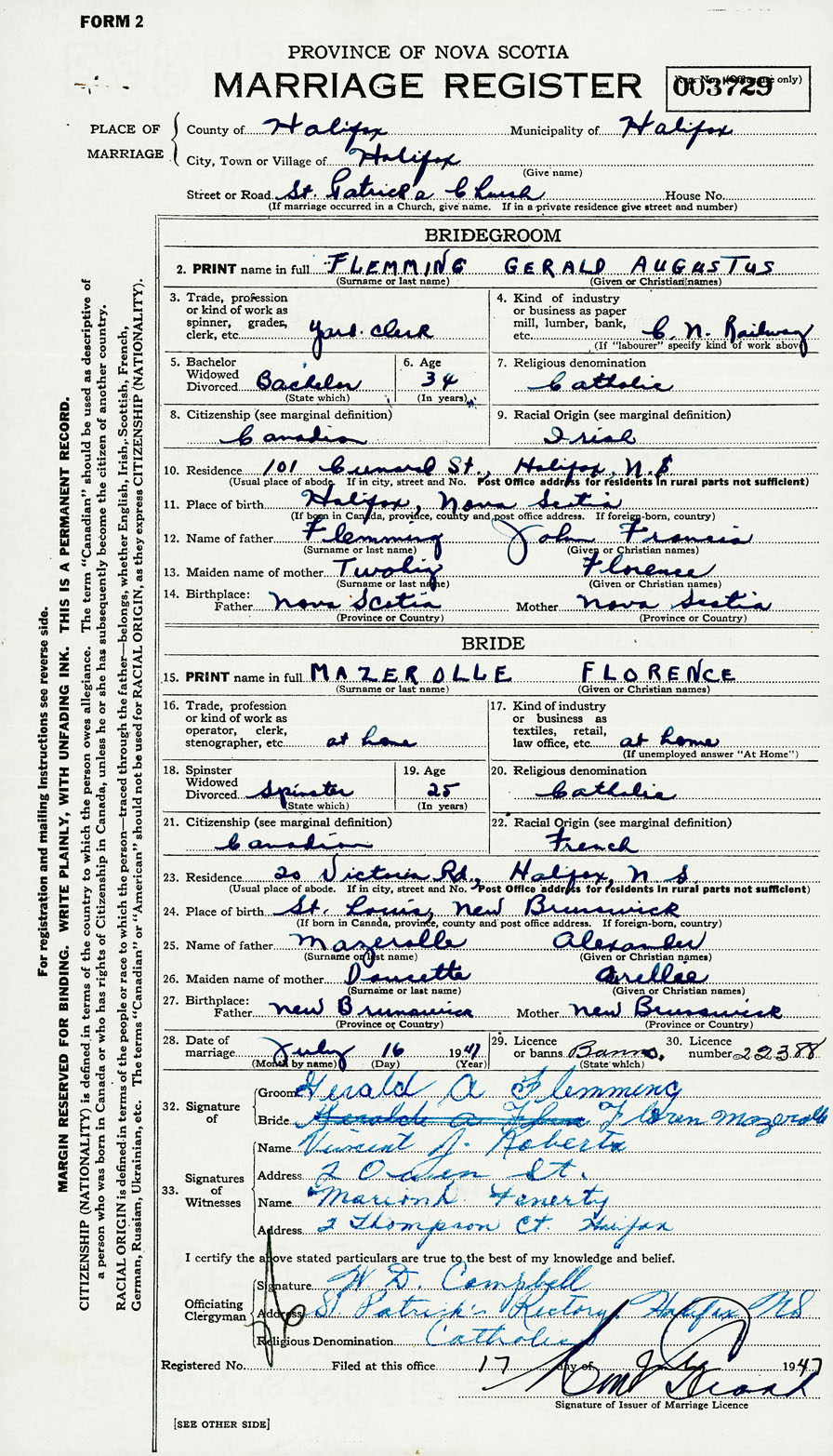 28. Date of marriage July 16 1947 29. By license or banns License 30. License number 22388