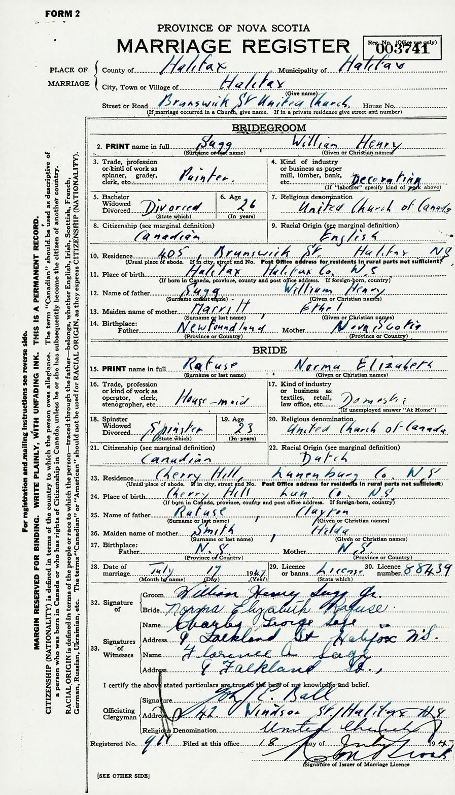 28. Date of marriage July 17 1947 29. By license or banns License 30. License number 88439