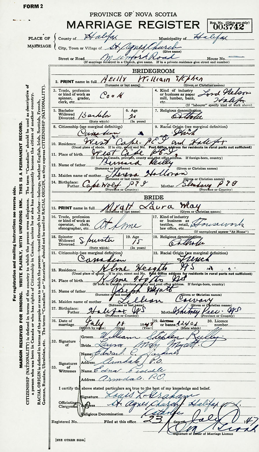 28. Date of marriage July 19 1947 29. By license or banns License 30. License number
