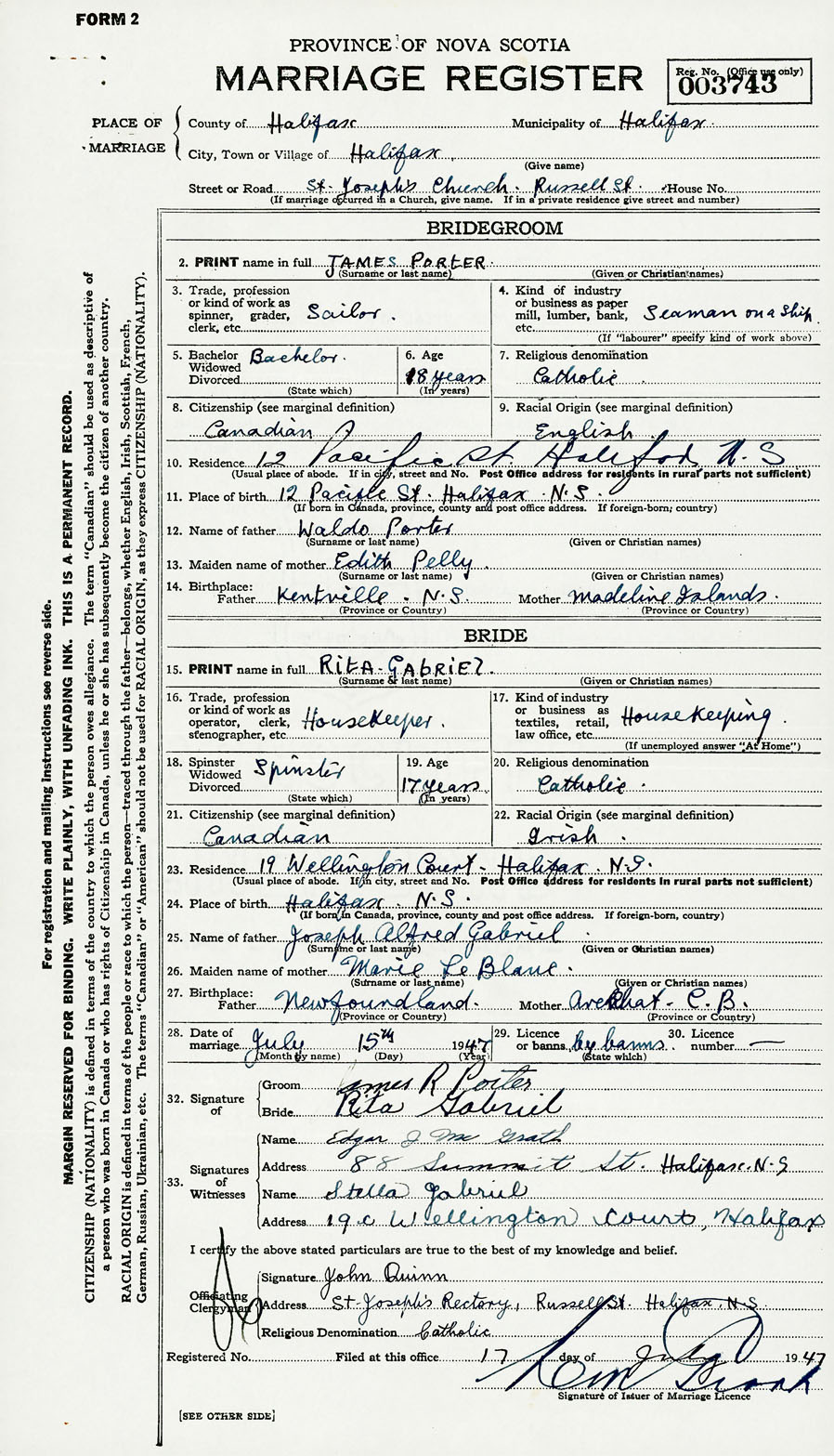 28. Date of marriage July 15 1947 29. By license or banns License 30. License number