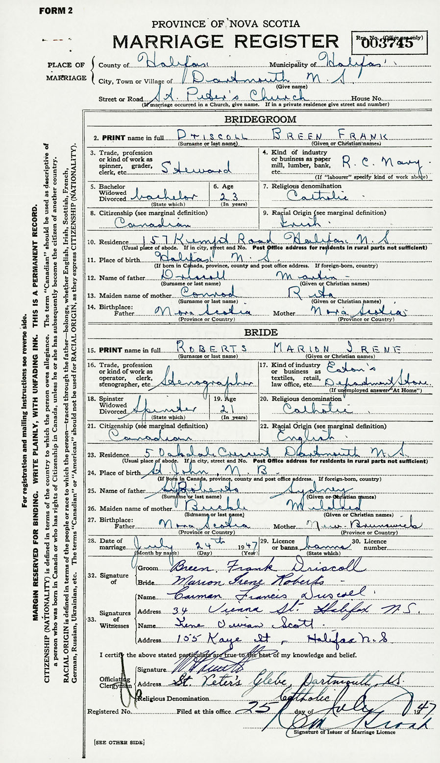 28. Date of marriage July 24 1947 29. By license or banns License 30. License number
