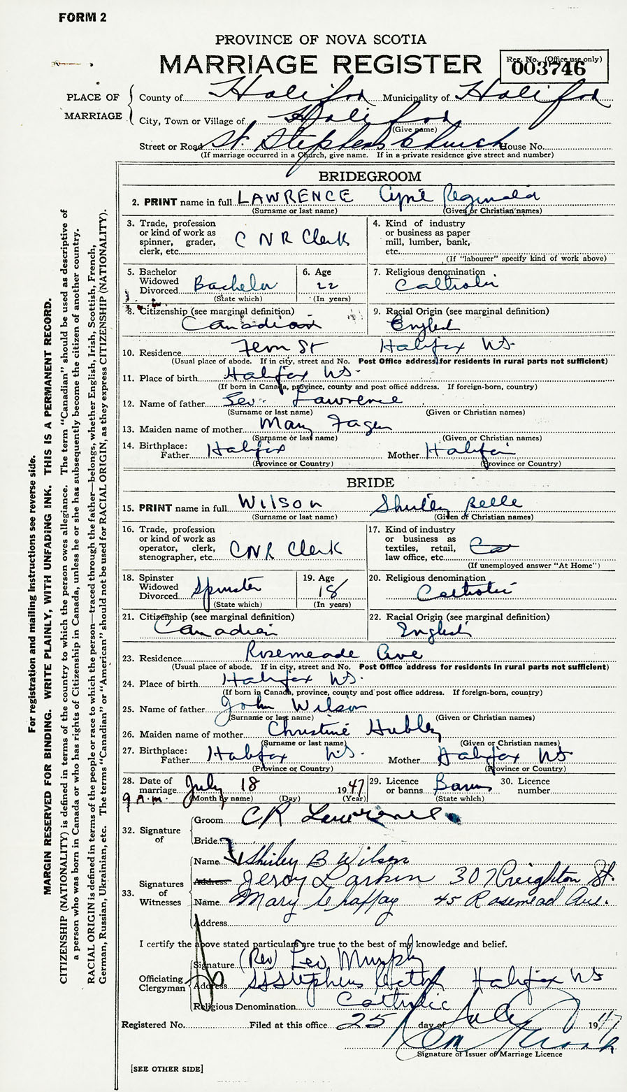 28. Date of marriage July 18 1947 29. By license or banns License 30. License number