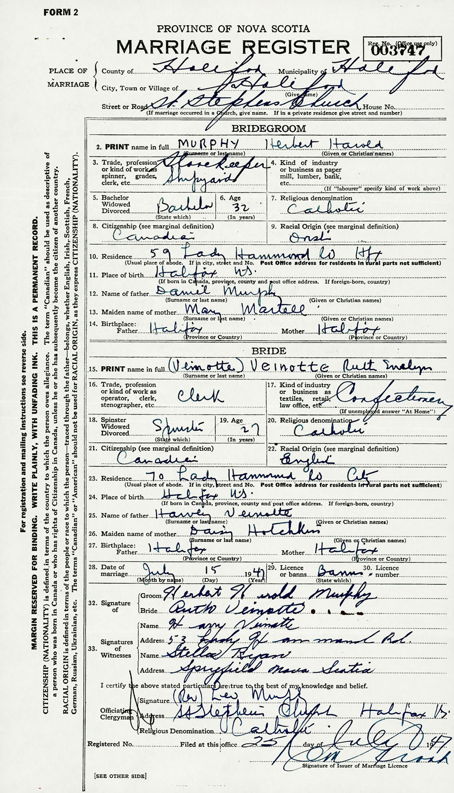 28. Date of marriage July 15 1947 29. By license or banns License 30. License number
